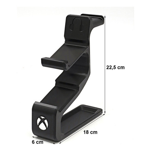 Descrição: O Suporte foi desenvolvido para acomodar com perfeição 2 controles de Xbox (atende os modelos One, X e S) e 1 Headset/Headphone, de forma a organizar seu setup, deixando seu ambiente organizado e muito bem decorado.